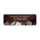 Elegant rustic wedding return address labels featuring beautiful snow capped mountains and pine trees with modern typography against a barn wood background.