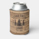 Rustic can cooler featuring brown country wood plank and scenic wilderness forest trees design personalised with your custom text. Ideal for a family cabin, lake house, rustic lodge and vacation home rental property merchandise or guest favour gifts. ASSISTANCE: For help with design modification or personalisation, colour change, resizing, transferring the design to another product or if you would like coordinating items, contact the designer BEFORE ordering via Zazzle Chat or email makeitaboutyoustore@gmail.com.