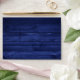 Personalised navy blue rustic wood wedding envelopes with a return address on a rustic wood background.