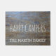 Cute rustic home decor gift for rvers, retired travelers, hikers, campers, and nature lovers is this personalised wood look doormat that reads- Happy Campers with a template for adding family name below in white letters. Against a background photo of rustic, distressed wood that is scarred and old. Great retirement gift, too. Would be right at home in front of an RV or cosy log cabin.