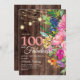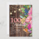 Beautiful pink, blue, orange, and yellow watercolor floral and greenery botanical 100 and Fabulous 100th birthday party invitation for women on a rustic dark brown wood background with string lights and a cute cursive script font. The back of this card is a matching wood background. Contact us for help with customisation or to request matching products.