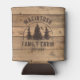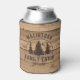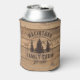Personalised can cooler or coozie featuring a rustic, country wood plank design with forest pine trees and your custom text in your choice of font style and colours (shown with NAME FAMILY CABIN and year established date in brown). ASSISTANCE: For help with design modification or personalisation, transferring the design to another product or if you would like coordinating items, contact the designer BEFORE ORDERING via the Zazzle Chat MESSAGE tab below or email makeitaboutyoustore@gmail.com.
