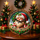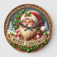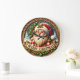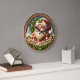 This festive round clock features a charming, three-dimensional styled Santa surrounded by a snowy winter forest scene. Santa, with his jolly expression and striped scarf, holds a banner reading "MERRY CHRISTMAS." The design is bordered by a wooden frame and intricate holly and berry details, giving the piece a cozy, rustic, carved wood aesthetic perfect for holiday wall decor.