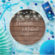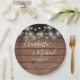 An elegant wedding plate featuring pretty string lights can be personalised with signature style names and your special wedding date on a rustic wood panels background. Designed by Thisisnotme©