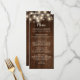 Rustic wood string light wedding menu features pink peonies in a mason jar.