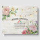 Wedding Guestbook Templates - Vintage Watercolor Pink Flowers and Elegant String Lights on Rustic Light White Wash Soft Wood Texture Background.