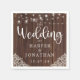Rustic Wood String Lights Lace Wedding Table and Cocktail Napkins, featuring a rustic wood background with twinkling strings of lights and vintage style lace in the bottom corners. Add your custom details for a rustic, chic look! Please contact us at cedarandstring@gmail.com if you need assistance with the design or matching products.