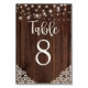 Rustic Wood String Lights Lace Wedding Table Numbers featuring a rustic wood background with twinkling strings of lights and vintage style lace in the bottom corners.