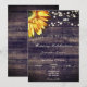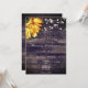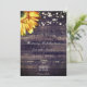 Invite friends and family to your rustic wedding! This beautiful card depicts a sunflower, wood background and string lights. Customise with the couple's names, and venue details!