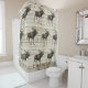 Rustic wood walking moose family name shower curtain for your cabin or rustic home. Earthy neutral, wood effect with faux tack edging, much like in a wine barrel.