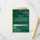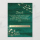 Elegant, modern, rustic wood green wedding details card with website, gold gilded floral lace and string lights.