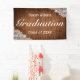 Stylish graduation banner. Rustic style with wood planks background and white lace decor.