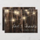 Rustic Wood With String Lights Wedding Thank You Card . The Design has Love & thanks Written in white classy font along with the names of the newly weds on a rustic wood background. Back of the card has other details. This card is a part of a collection.