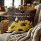 Decorator pillow with a rustic dark brown wood design decorated with bright yellow sunflowers and a whimsical script font, "Friends are the sunshine of life."