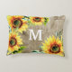 Pretty customised accent pillow with bright yellow sunflowers on a rustic wood background. Personalised with your monogram/initial.