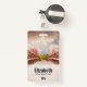 Personalised name badge with a scenic photograph. A wooden bridge leading towards a pathway surrounded by forest trees changing colour.