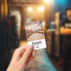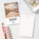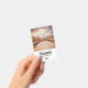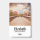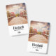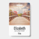 Personalised name badge with a scenic photograph. A wooden bridge leading towards a pathway surrounded by forest trees changing colour.