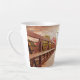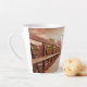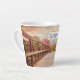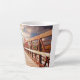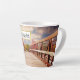 A latte mug with a scenic photograph. A wooden bridge leading towards a pathway surrounded by forest trees changing colour.
