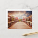A postcard with a scenic looking wooden bridge leading into a pathway surrounded by forest trees changing colour.