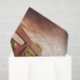 Tissue paper with a scenic photograph. A wooden bridge leading towards a pathway surrounded by forest trees changing colour.
