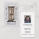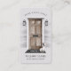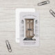 Beautiful rustic country chic style real estate business card. Our design features a rustic wooden country door accented icon black door handle, lock, and mail slot. Black outdoor lights and light grey siding, with a black Hello door mat and cute little french bulldog. Personalise with your business name and optional text arced above the doorway. The reverse side features the name and contact info along with an optional photo. All illustrations are original artwork by Moodthology.