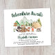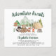 Cute budget-friendly rustic baby shower invitation featuring an illustration of woodland animals with their tent and campfire camping in the mountains and forest , and "Adventure Awaits" and the mother-to-be's name in a dark green script.