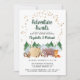 Sweet rustic couple's baby shower invitation featuring a cute illustration of woodland animals with their tent camping in the mountains and forest, an overlay of gold stars and "Adventure Awaits" and the names of the mother and father in a dark hunter green script. Easily personalise the shower details.