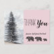 A rustic nature woodlands orientated thank you card featuring a majestic forest pine tree and walking bears against a soft pastel grey blue background. Mama, Dad and baby. Post baby shower thank you card.
