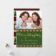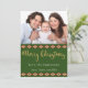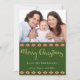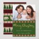 The festive holiday design on the back of this card features a combination of red tartan plaid, southwestern diamonds, pine trees, and woodland animals, including bear, elk, crow, and fox, on a forest green background. On the front is a photo that you can place with your own, and the words "Merry Christmas" in popular gold script typography on a forest green background, followed by two white "from" lines that you can personalise.