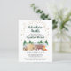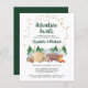 Budget-friendly rustic couples baby shower invitation featuring a cute illustration of woodland animals with their tent camping in the mountains and forest, an overlay of gold stars and "Adventure Awaits" and the names of the mother and father in a dark green script.