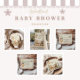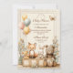 Celebrate the mum-to-be with this rustic woodland baby shower design featuring a sweet fox, bunny, and teddy bear sitting on wooden toy blocks, surrounded by wildflowers, butterflies, and pastel balloons. A charming countryside theme that feels warm, cosy, and perfect for a forest-inspired celebration.