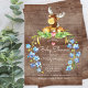 Cute watercolor woodland boys baby shower featuring an adorable mum moose with her baby with leaves & blue flowers set on a rustic brown wood background.