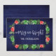 Rustic and whimsical red and green holiday mushrooms, woodland greenery and dark navy blue wood.