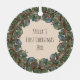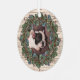 Rustic single pet photo metal ornament with leafy greenery and winter berries wreath on a pale wood background.