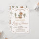 Gender neutral cowboy themed baby shower invitation featuring some cowboy boots, cowboy hat, cactus, horseshoe, rope, rope style text and a hint of a cow print pattern. This baby shower birthday invitation is ideal for a wild west, southern or western style baby shower.