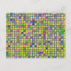 This product is made from a rustic multicolored textured mosaic square tiles pattern of mostly vivid shades of yellow and green, with bright blue, hot pink, and various warm earth tones areas in a random arrangement. This unique abstract design has a matte texture much like that of unglazed fired clay, with a sprinkling of concentric circular "bubbles."