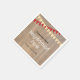 This neighbourhood picnic napkin features a rustic design. Red and yellow plaid flag banners, accent the wood background.