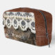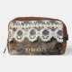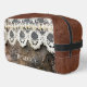Delightfully rustic, large western style toiletry bag, aka Dopp Kit, has a dark tooled leather background and a faux antique lace panel with a row of applied pearls. Personalise it with the easy to use template provided. The font is completely customisable should you want to use a different style type face.