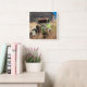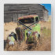 Rusting car in front of abandoned farm square wall clock