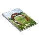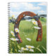 A rusty horseshoe hangs on a barbed wire against a backdrop of a green field dotted with white daisies under a cloudy sky in watercolor.