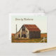 Text reads "Drive by Oklahoma" in a rusty brown that matches the rusty roof on the old barn that is featured in this photo that is iconic of the open prairies of Oklahoma USA. Add your own text to make it truly your own. #rustic #postcard