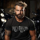A typography design tee with the word Ruthless on it in large ornate silver letters.