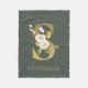 Letter S monogram floral blanket. Letter S in golden script with green watercolor leaves and yellow white florals. Personalised with name. Set on dark green background. Easy to customise. Get yours today!