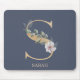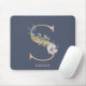 Letter S monogram floral. Letter S in golden brown texture accented with green watercolor compound leaves, flower blossoms and gold dust droplets. Personalised with name in matching font.