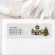 Destei's original cartoon illustration of a cute sable Shetland Sheepdog / Sheltie breed dog. Next to the dog there is a personalizable text area. The dog is placed in a festive living room that has a fireplace. The fireplace is on and it has two red stockings hanging on the side of it. On the top of the fireplace there is a green wreath that is decorated with a red bow and some yellow circles as lights. On top of the mantle there are three small triangle shaped trees also decorated with yellow circles as lights. The mantle also has two beige candles on it. Next to the fireplace there is a festive green Christmas tree with two presents under it. The Christmas tree is decorated with red and yellow round ornaments and a grey garland. On the top of the tree there is a yellow star.