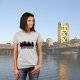 Stylish t-shirt features skyline silhouette of Sacramento, CA with map coordinates on a watercolor splash background.