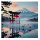 This rare moment captures the convergence of Japan's most revered symbols: the majestic Mount Fuji, eternal and unchanging; the sacred torii gates, bridging the mortal and divine realms; and the red-crowned cranes, living embodiments of luck and longevity. The morning mist weaves through the scene like silk, softening the boundaries between water, air, and spirit.