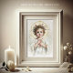 Featuring a beautiful traditional Catholic image of the Sacred Heart of Jesus as a child with the hearts of Jesus, Mary, and Joseph in gold on the back. A prayer is also on the back for the bride and groom. All text and fonts can be modified.