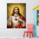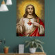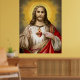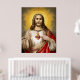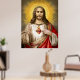 This image is a traditional depiction of the Sacred Heart of Jesus. It features a figure widely recognised as Jesus Christ, shown in a half-body view, looking directly forward. He has long hair and a beard, and wears a reddish robe draped over a white garment. His right hand is raised in a gesture often associated with blessing or teaching, while his left hand points towards or rests near his chest. Prominently displayed on his chest is the Sacred Heart, typically depicted as a flaming heart encircled by a crown of thorns and topped with a cross. A strong golden light or halo radiates outwards from behind his head and around his body, emphasizing his divine nature. The artwork is rendered in a classical religious painting style with warm colours and soft, devotional lighting.