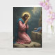This design shows a kneeling man on rugged stone, wrapped in soft rose robes with a deep blue mantle, his hands clasped and head bowed beneath a thin ring of golden light. Dark, rolling clouds crowd the sky, while the warm glow around him cuts a gentle path through the shadows like a quiet promise. Off to the right, another figure lies stretched out on an old stone ledge, dressed in muted blue and earthy brown, their relaxed posture reading like trust between close companions. The rocky ground is rough and uneven, dotted with a few small patches of green, and a single 🌷 near the edge adds a tender note to the stark setting. Strong contrasts of light and shade shape the folds of fabric, making the kneeling figure’s shoulders look both steady and vulnerable. Any greeting text could sit along the lower margin in soft gold, with a smaller line in pale blue tucked near the right side by the resting figure, and a tiny 🐇 placed beside it. The scene is framed by jagged stone in the foreground, with the brightest highlight falling across the kneeling figure’s hands and the resting figure’s sleeve.